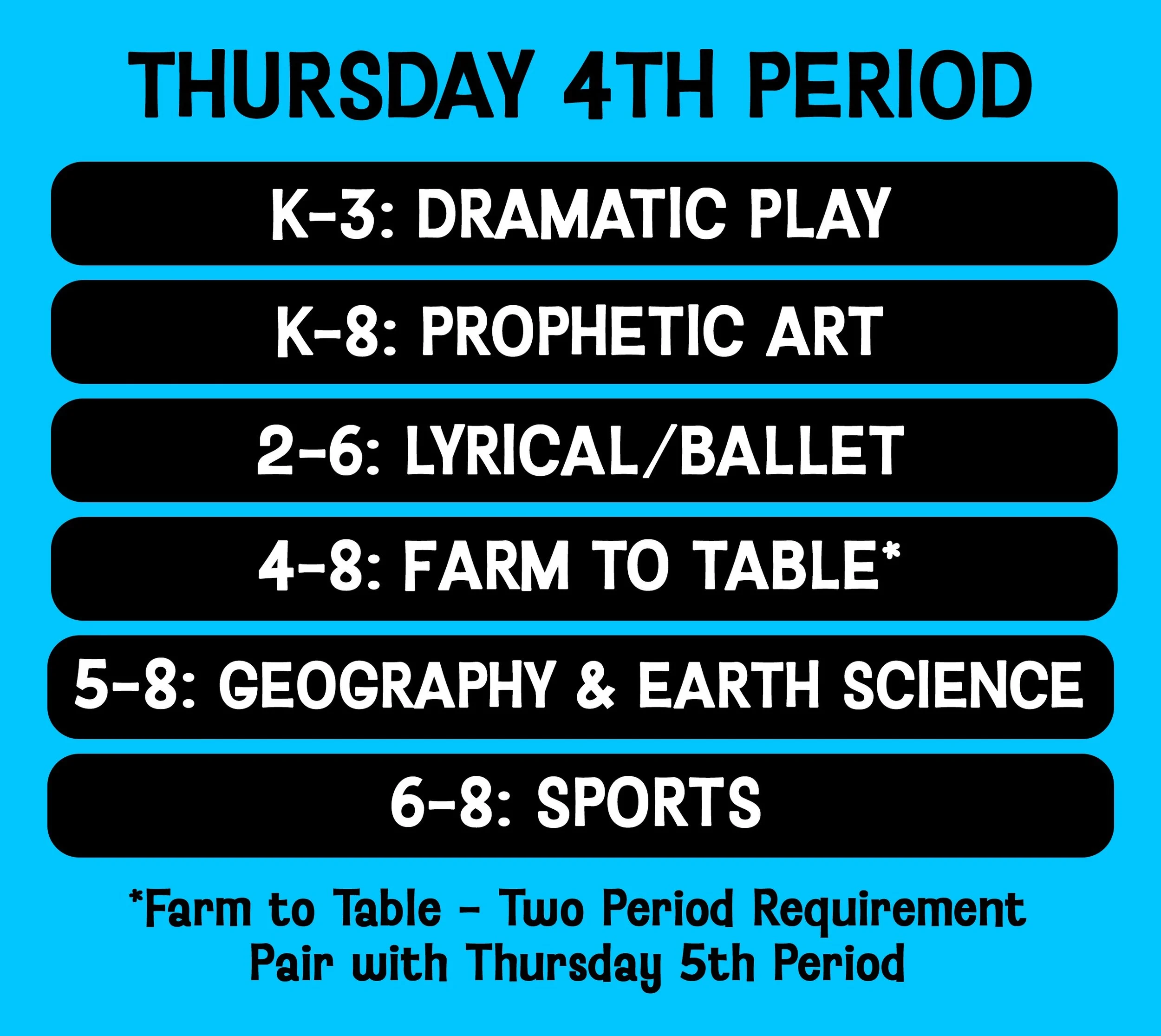 • Tuesdays: We will spend time preparing for chapel and developing our musical and vocal abilities during 5th period.